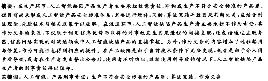 在生产环节,人工智能缺陷产品生产者主要承担故意责任,即构成生产不符合安全标准的产品罪。 但目前尚未形成人工智能产品安全标准体系,需要进行增补;同时,算法黑箱导致因果判断失灵,应结合刑 法理论、先进技术与相关政策予以破解。在流通环节,人工智能缺陷产品生产者主要承担不作为责任,其 作为义务的来源,不仅限于利用信息优势而取得的对事故发生因果进程的间接支配,还包括通过主服务 器、信息网络实现的对流通领域中人工智能缺陷产品的直接掌控。另外,作为义务的内容增加了远程禁用 与修复,作为可能性也得到相应的提升。在产品缺陷是由于当前技术条件下无法发现,或者是由于介入因 素所导致,或者在生产者发出警示公告后,使用者不听劝阻、继续使用所导致的情况下,人工智能缺陷产品 生产者的刑事责任得以阻却。