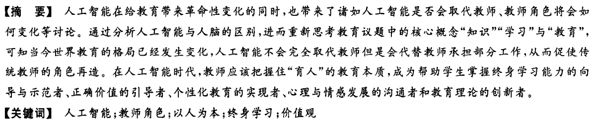 人工智能在给教育带来革命性变化的同时,也带来了诸如人工智能是否会取代教师、教师角色将会如 何变化等讨论。通过分析人工智能与人脑的区别,进而重新思考教育议题中的核心概念“知识”“学习”与“教育”, 可知当今世界教育的格局已经发生变化,人工智能不会完全取代教师但是会代替教师承担部分工作,从而促使传 统教师的角色再造。在人工智能时代,教师应该把握住“育人”的教育本质,成为帮助学生掌握终身学习能力的向 导与示范者、正确价值的引导者、个性化教育的实现者、心理与情感发展的沟通者和教育理论的创新者。