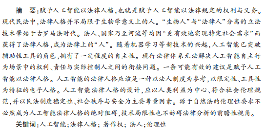 :赋予人工智能以法律人格,也就是赋予人工智能以法律规定的权利与义务。 现代民法中,法律人格并不局限于生物学意义上的人。 “生物人”与“法律人”分离的立法 技术肇始于古罗马法时代。 法人、国家乃至河流等均因“更有效地实现特定社会需求”而 获得了法律人格,成为法律上的“人”。 随着机器学习等新技术的兴起,人工智能已突破 辅助性工具的角色,拥有了一定程度的自主性。 现行法律体系无法解决人工智能自主行 为场景中的权利、责任与实际控制人之间的衔接问题。 一条可能有效的建议是赋予人工 智能以法律人格。 人工智能的法律人格应该是一种以法人制度为参考,以限定性、工具性 为特征的电子人格。 人工智能法律人格的设计,应以人类利益为中心、符合社会伦理规 范,并以民法制度稳定性、社会秩序与安全为主要考量因素。 源于自然法的伦理性要求不 必然成为人工智能法律人格的绝对阻碍,技术局限性也不妨碍法律分析的前瞻性视角。