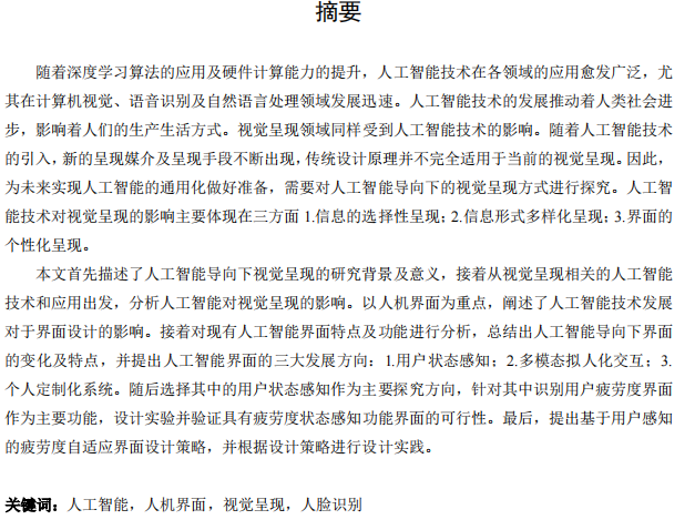 随着深度学习算法的应用及硬件计算能力的提升,人工智能技术在各领域的应用愈发广泛,尤 其在计算机视觉、语音识别及自然语言处理领域发展迅速。人工智能技术的发展推动着人类社会进 步,影响着人们的生产生活方式。视觉呈现领域同样受到人工智能技术的影响。随着人工智能技术 的引入,新的呈现媒介及呈现手段不断出现,传统设计原理并不完全适用于当前的视觉呈现。因此, 为未来实现人工智能的通用化做好准备,需要对人工智能导向下的视觉呈现方式进行探究。人工智 能技术对视觉呈现的影响主要体现在三方面 1.信息的选择性呈现;2.信息形式多样化呈现;3.界面的 个性化呈现。