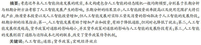 考虑近年来人工智能快速发展的现实,本文构建包含人工智能的动态随机一般均衡模型,分别基于长期分析 与短期分析方法考察了人工智能发展产生的影响。 长期分析的结果显示:人工智能投资效率提高以及使用范围扩大将引 起产出、物质资本投资以及人工智能投资增加,但人工智能发展对实际工资及消费的影响取决于人工智能的发展阶段。 短期分析的结果指出:第一,人工智能发展有助于增加产出和投资,有助于降低通胀,但同时也降低了就业;第二,人工智 能发展程度越高,货币政策对通胀的影响越小,并且货币政策对通胀的影响与人工智能的发展阶段有关;第三,人工智能 的发展削弱了通胀与边际成本之间的联系,改变了货币政策传导机制。