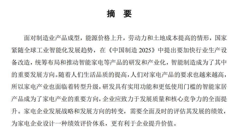 面对制造业产品成型,能源价格上升,劳动力和土地成本提高的情形,国家 紧随全球工业智能化发展趋势,在《中国制造 2025》中提出要加快行业生产设 备改造,统筹布局和推动智能家电等产品的研发和产业化,智能制造成为了其中 的重要发展方向。随着人们生活品质的提高,人们对家电产品的要求也越来越高, 所以家电产业也面临着转型升级,研发具有实用功能和更低使用门槛的智能家居 产品成为了家电产业的重要方向,企业应致力于发展质量和核心竞争力的全面提 升。家电企业发展战略和发展方向的转变,需要全面及时的评估其发展的绩效, 为家电企业设计一种绩效评价体系,更有利于企业提升价值。