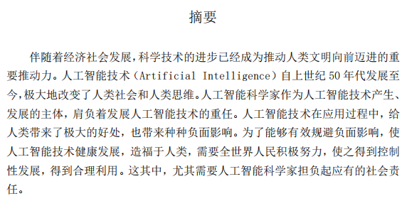 伴随着经济社会发展,科学技术的进步已经成为推动人类文明向前迈进的重 要推动力。人工智能技术(Artificial Intelligence)自上世纪 50 年代发展至 今,极大地改变了人类社会和人类思维。人工智能科学家作为人工智能技术产生、 发展的主体,肩负着发展人工智能技术的重任。人工智能技术在应用过程中,给 人类带来了极大的好处,也带来种种负面影响。为了能够有效规避负面影响,使 人工智能技术健康发展,造福于人类,需要全世界人民积极努力,使之得到控制 性发展,得到合理利用。这其中,尤其需要人工智能科学家担负起应有的社会责 任。