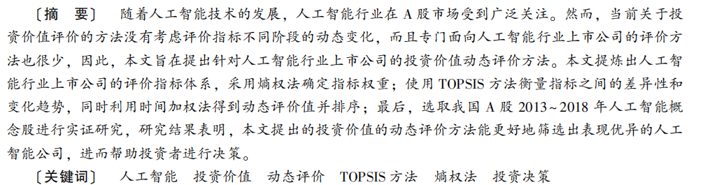随着人工智能技术的发展, 人工智能行业在 A 股市场受到广泛关注。 然而, 当前关于投 资价值评价的方法没有考虑评价指标不同阶段的动态变化, 而且专门面向人工智能行业上市公司的评价方 法也很少, 因此, 本文旨在提出针对人工智能行业上市公司的投资价值动态评价方法。 本文提炼出人工智 能行业上市公司的评价指标体系, 采用熵权法确定指标权重; 使用 TOPSIS 方法衡量指标之间的差异性和 变化趋势, 同时利用时间加权法得到动态评价值并排序; 最后, 选取我国 A 股 2013 ~ 2018 年人工智能概 念股进行实证研究, 研究结果表明, 本文提出的投资价值的动态评价方法能更好地筛选出表现优异的人工 智能公司, 进而帮助投资者进行决策。