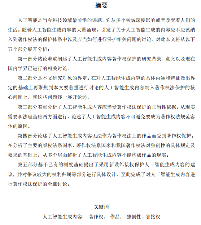 与人工智能相关的法律问题,是近些年学界研究的热点课题,人工智能生成物的保 护路径就是其中热点课题之一。2017 年 7 月 5 日,微软宣布放弃小冰创作诗歌的版权, 引发热议。我国首例因人工智能生成物引起的著作权纠纷案——菲林律师事务所诉百度 网讯科技公司侵害其著作权一案,法院虽然依法作出了判决,但对于判决结果依然存在 诸多争议之处。人工智能生成物的相关权益是否需要法律手段予以保障?它是否可以纳 入作品保护范围?如果不可,应该采取何种保护模式?人工智能生成物的权利归属于 谁?以现有的研究成果来看,学者们对于人工智能生成物意见的分歧点聚焦在,法律属 性、保护模式以及权利归属的法律问题上。而这些问题涉及伦理道德、技术发展以及国 家政策等重要因素,使得解决问题的过程有些复杂。