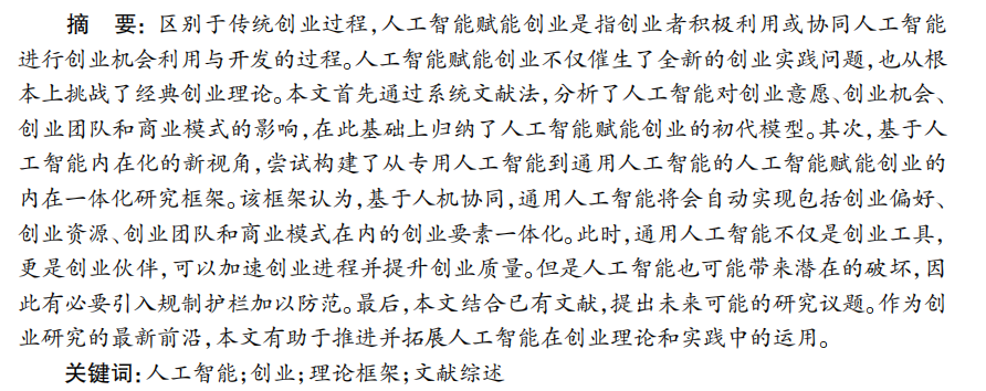 区别于传统创业过程,人工智能赋能创业是指创业者积极利用或协同人工智能 进行创业机会利用与开发的过程。人工智能赋能创业不仅催生了全新的创业实践问题,也从根 本上挑战了经典创业理论。本文首先通过系统文献法,分析了人工智能对创业意愿、创业机会、 创业团队和商业模式的影响,在此基础上归纳了人工智能赋能创业的初代模型。其次,基于人 工智能内在化的新视角,尝试构建了从专用人工智能到通用人工智能的人工智能赋能创业的 内在一体化研究框架。该框架认为,基于人机协同,通用人工智能将会自动实现包括创业偏好、 创业资源、创业团队和商业模式在内的创业要素一体化。此时,通用人工智能不仅是创业工具, 更是创业伙伴,可以加速创业进程并提升创业质量。但是人工智能也可能带来潜在的破坏,因 此有必要引入规制护栏加以防范。最后,本文结合已有文献,提出未来可能的研究议题。作为创 业研究的最新前沿,本文有助于推进并拓展人工智能在创业理论和实践中的运用。