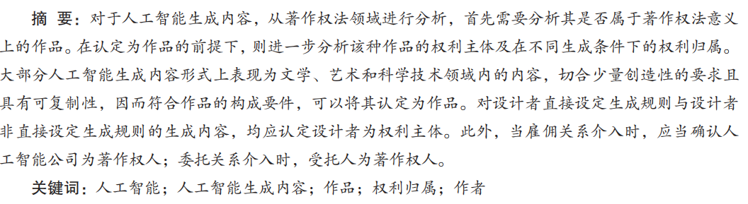 对于人工智能生成内容,从著作权法领域进行分析,首先需要分析其是否属于著作权法意义 上的作品。在认定为作品的前提下,则进一步分析该种作品的权利主体及在不同生成条件下的权利归属。 大部分人工智能生成内容形式上表现为文学、艺术和科学技术领域内的内容,切合少量创造性的要求且 具有可复制性,因而符合作品的构成要件,可以将其认定为作品。对设计者直接设定生成规则与设计者 非直接设定生成规则的生成内容,均应认定设计者为权利主体。此外,当雇佣关系介入时,应当确认人 工智能公司为著作权人;委托关系介入时,受托人为著作权人。