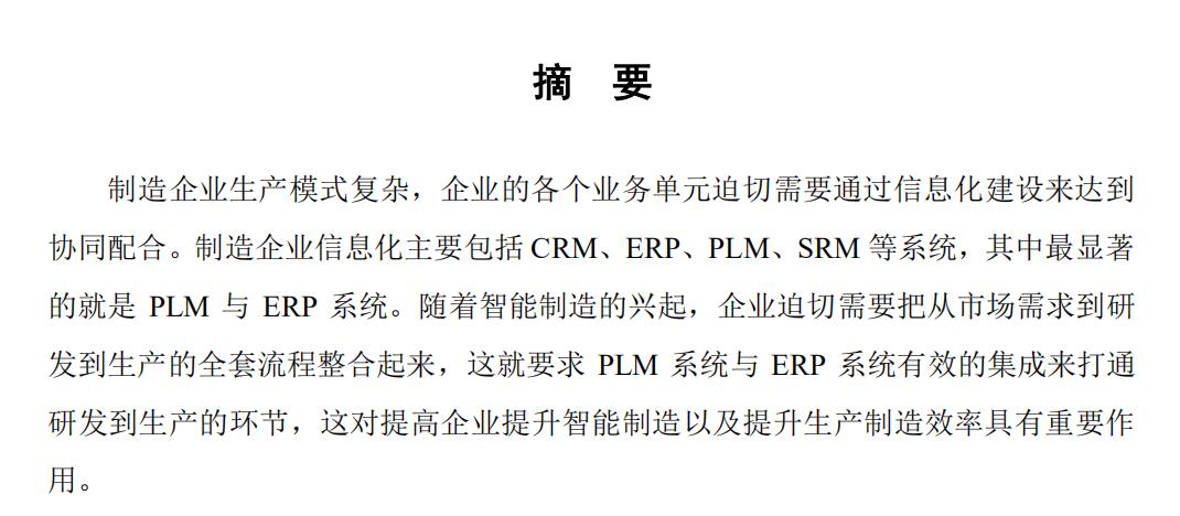 制造企业生产模式复杂,企业的各个业务单元迫切需要通过信息化建设来达到协同配合。制造企业信息化主要包括 CRM、ERP、PLM、SRM 等系统,其中最显著的就是 PLM 与 ERP 系统。随着智能制造的兴起,企业迫切需要把从市场需求到研发到生产的全套流程整合起来,这就要求 PLM 系统与 ERP 系统有效的集成来打通研发到生产的环节,这对提高企业提升智能制造以及提升生产制造效率具有重要作用。