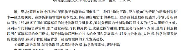 物联网在制造领域的深度渗透和落地应用催生了一种以“物物互联 、泛在感知”为特征的新型制造技 术 — 制造物联网 。 在解析制造物联网基本概念 、特征和应用需求的基础上 ,以多源制造数据的感知 、传输 、分析和 应用为主线 ,阐述了面向离散车间的制造物联网关键技术 ;通过分析国内外制造物联网技术的相关应用研究文献 , 分别从车间制造资源管理 、生产过程调控 、车间物流优化 、质量监控与追溯 、智能服务与保障 5 方面 ,总结了制造物 联网在离散车间的应用模式 ;基于制造物联网核心技术的应用和发展需求 ,以及与云制造 、大数据 、信息物理系统 的紧密关联 ,探讨了智能制造背景下制造物联网的未来发展趋势 。