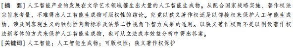 人工智能产业的发展在文学艺术领域催生出大量的人工智能生成物。 从配合国家战略实施、 著作权法 宗旨来考量, 不难得出人工智能生成物可版权性的结论。 究竟以狭义著作权还是以邻接权来保护人工智能生成 物, 涉及到客观主义的独创性判断标准及法第二性视角下智力成果的适用。 以狭义著作权而不是以创设著作权 法新客体的方式来保护人工智能生成物, 也可从立法成本效益分析中得出答案。