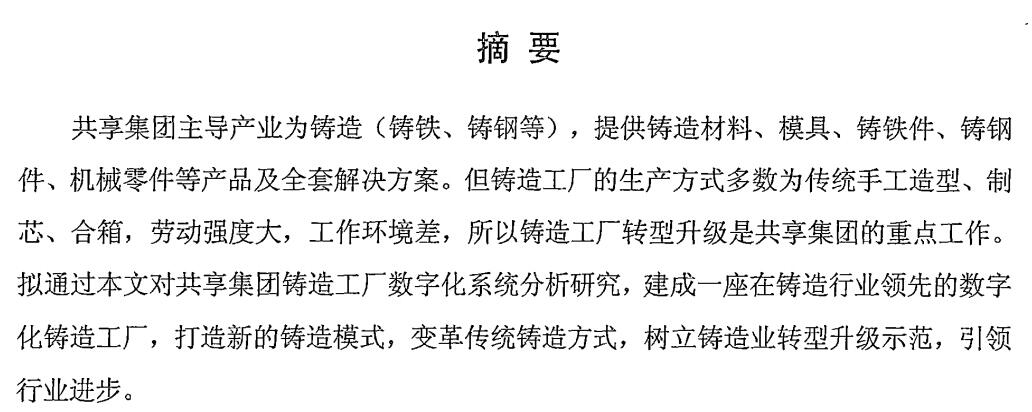 共享集团主导产业为铸造(铸铁、铸钢等),提供铸造材料、模具、铸铁件、铸钢件、机械零件等产品及全套解决方案。但铸造工厂的生产方式多数为传统手工造型、制芯、合箱,劳动强度大,工作环境差,所以铸造工厂转型升级是共享集团的重点工作。拟通过本文对共享集团铸造工厂数字化系统分析研究,建成一座在铸造行业领先的数字化铸造工厂,打造新的铸造模式,变革传统铸造方式,树立铸造业转型升级示范,引领行业进步。
