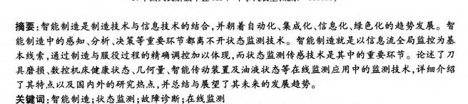 智能制造是制造技术与信息技术的结合,并朝着自动化、集成化、信息化、绿色化的趋势发展。智 能制造中的感知、分析、决策等重要环节都离不开状态监测技术。智能制造就是以信息流全局监控为基 本线索,通过制造与服役过程的精确调控加以体现,而状态监测传感技术是其中的重要环节。论述了刀 具磨损、数控机床健康状态、几何量、智能传动装置及油液状态等在线监测应用中的监测技术,详细介绍 了其特点以及国内外的研究热点,并总结与展望了其未来的发展趋势。