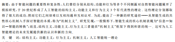 由于智能问题的重要性和复杂性,人们曾经分别从结构、功能和行为等多个不同侧面对自然智能问题展开了 模拟研究,于 !" 世纪形成了人工智能的结构主义、功能主义和行为主义 % 个有代表性的理论 = 这些理论分别都取 得了很大的成功,然而它们之间却难以互相沟通和互相认可 = 为此,提出了一种新的研究途径———从智能生成的共 性核心机制入手探讨智能的本质,称为“机制主义”= 研究发现:一般情形下,智能生成的核心机制表现为“信息—知 识—智能的转换”;而且,结构主义、功能主义、行为主义三者能在“机制主义”框架下得到和谐的统一 = 这可为人工 智能理论的未来发展提供新的认识和新的方向