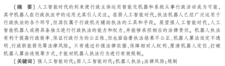 人工智能时代的到来使行政主体运用智能化机器和系统从事行政活动成为可能, 其中机器人在行政执法中的运用尤其引人关注。 在弱人工智能时代,执法机器人已经广泛运用于 行政执法的各个环节,但其仅属于行政机关辅助执法的工具和手段。 展望强人工智能时代,人工 智能机器人或将具备独立进行行政执法的能力和权力,并能够承担相应的法律责任。 机器人执法 有利于提高行政效率、保证行政行为的公正性,但也面临着执法结果不公正、机器人算法设定不透 明、行政职能弱化等法律风险。 只有通过补强法律依据、保障相对人权利、厘清机器人定位、打破 机器人算法歧视等方式,才能对机器人执法行为进行有效规制。