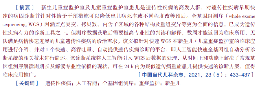 新生儿重症监护室及儿童重症监护室患儿是遗传性疾病的高发人群,对遗传性疾病早期快 速的病因诊断并针对性给予干预措施可以降低患儿病死率或不同程度改善预后。全基因组测序(whole exome sequencing, WGS)因涵盖点突变、拷贝数、内含子区域的各种结构及重组变异等更为全面的信息,已成为遗传 性疾病有力的诊断工具之一。但测序数据获取后需要极高专业性的判读和解释,数周才能返回为临床所用,无 法满足病情快速进展的儿童遗传性疾病的诊治需求。该文拟针对快速 WGS 在新生儿 / 儿童重症监护室的临床应 用进行介绍,并对 1 个快速、高吞吐量、自动提供遗传疾病诊断的平台,即人工智能快速全基因组自动分析诊 断系统的相关技术进行简述。该诊断系统将人工智能引入 WGS 后数据的处理,从时间上和功能上解决了常规基 因组测序解读周期长及解读专业性依赖的现状,可在 24 h 内为疑似遗传病重症患儿提供快速的诊断方案,值得 临床应用推广。
