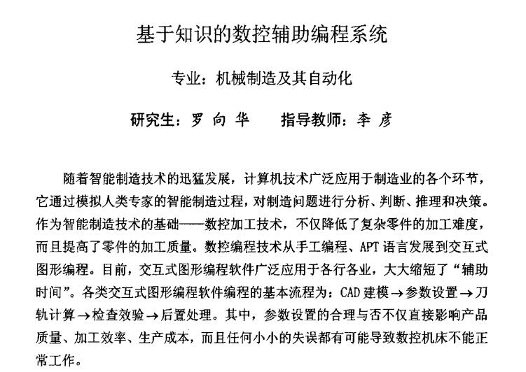随着智能制造技术的迅猛发展,计算机技术广泛应用于制造业的各个环节,它通过模拟人类专家的智能制造过程,对制造问题进行分析、判断、推理和决策。作为智能制造技术的基础——数控加工技术,不仅降低了复杂零件的加工难度,而且提高了零件的加工质量。数控编程技术从手工编程、AFrr语言发展到交互式图形编程。目前,交互式图形编程软件广泛应用于各行各业,大大缩短了“辅助时间”。各类交互式图形编程软件编程的基本流程为:cAD建模寸参数设置斗刀轨计算j检查效验一后置处理。其中,参数设置的合理与否不仅直接影响产品质量、加工效率、生产成本,而且任何小小的失误都有可能导致数控机床不能正常工作。