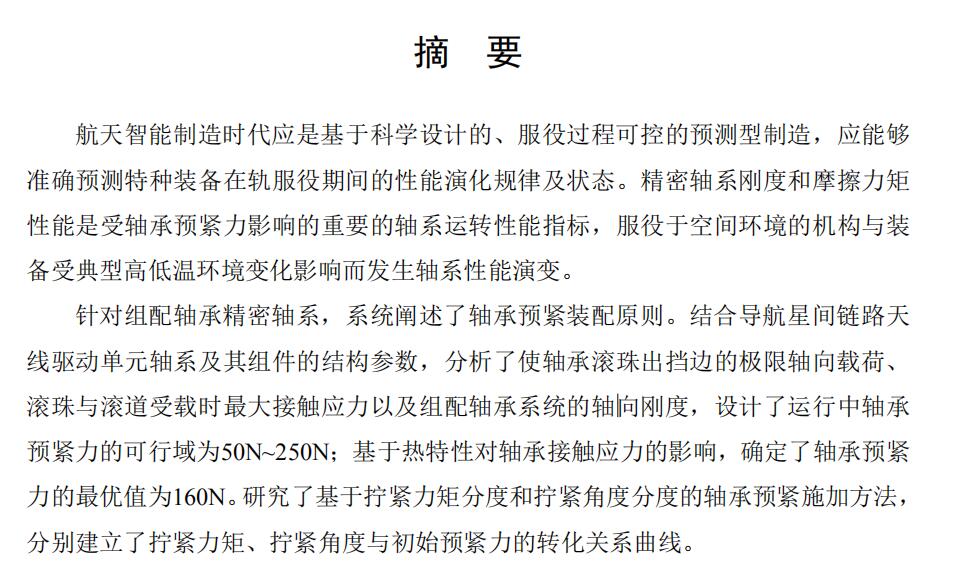 航天智能制造时代应是基于科学设计的、服役过程可控的预测型制造,应能够 准确预测特种装备在轨服役期间的性能演化规律及状态。精密轴系刚度和摩擦力矩 性能是受轴承预紧力影响的重要的轴系运转性能指标,服役于空间环境的机构与装 备受典型高低温环境变化影响而发生轴系性能演变。