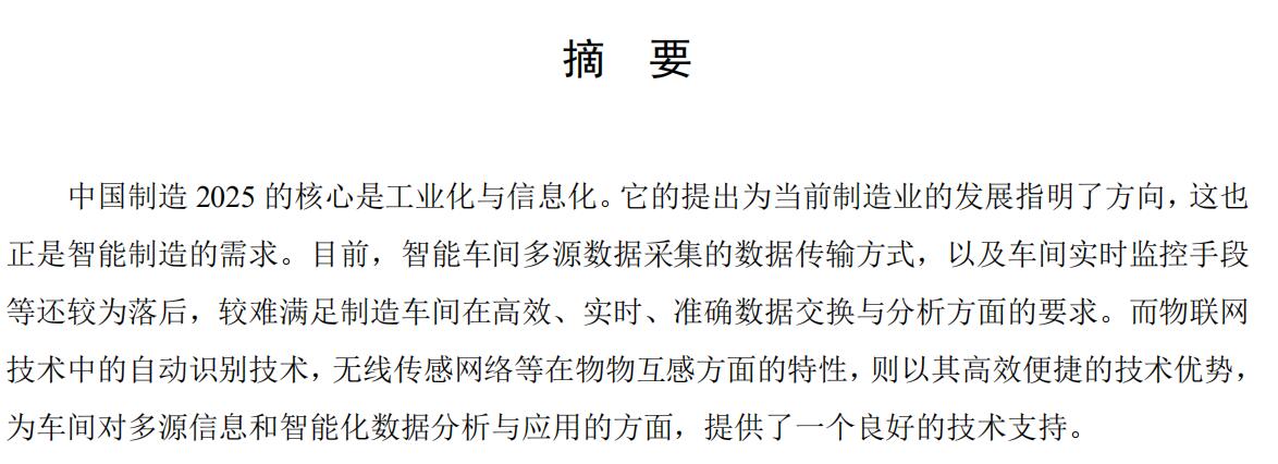 中国制造 2025 的核心是工业化与信息化。它的提出为当前制造业的发展指明了方向,这也正是智能制造的需求。目前,智能车间多源数据采集的数据传输方式,以及车间实时监控手段等还较为落后,较难满足制造车间在高效、实时、准确数据交换与分析方面的要求。而物联网技术中的自动识别技术,无线传感网络等在物物互感方面的特性,则以其高效便捷的技术优势,为车间对多源信息和智能化数据分析与应用的方面,提供了一个良好的技术支持。
