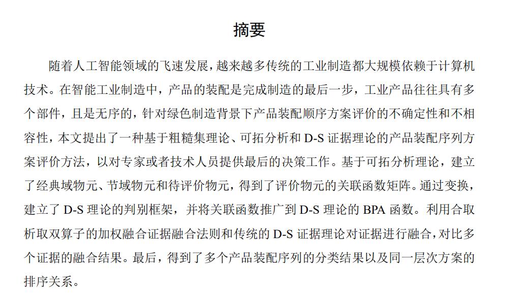 随着人工智能领域的飞速发展,越来越多传统的工业制造都大规模依赖于计算机 技术。在智能工业制造中,产品的装配是完成制造的最后一步,工业产品往往具有多 个部件,且是无序的,针对绿色制造背景下产品装配顺序方案评价的不确定性和不相 容性,本文提出了一种基于粗糙集理论、可拓分析和 D-S 证据理论的产品装配序列方 案评价方法,以对专家或者技术人员提供最后的决策工作。基于可拓分析理论,建立 了经典域物元、节域物元和待评价物元,得到了评价物元的关联函数矩阵。通过变换, 建立了 D-S 理论的判别框架,并将关联函数推广到 D-S 理论的 BPA 函数。利用合取 析取双算子的加权融合证据融合法则和传统的 D-S 证据理论对证据进行融合,对比多 个证据的融合结果。最后,得到了多个产品装配序列的分类结果以及同一层次方案的 排序关系。