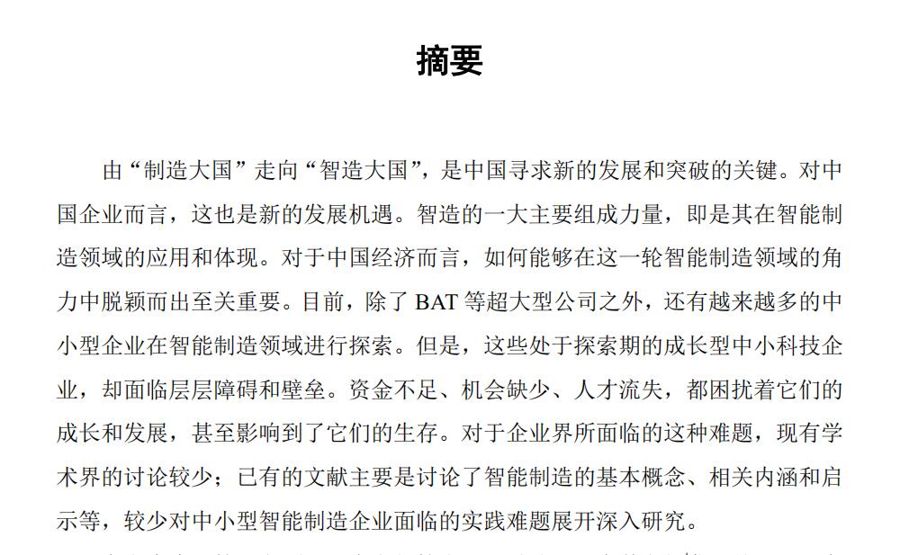 由“制造大国”走向“智造大国”,是中国寻求新的发展和突破的关键。对中 国企业而言,这也是新的发展机遇。智造的一大主要组成力量,即是其在智能制 造领域的应用和体现。对于中国经济而言,如何能够在这一轮智能制造领域的角 力中脱颖而出至关重要。目前,除了 BAT 等超大型公司之外,还有越来越多的中 小型企业在智能制造领域进行探索。但是,这些处于探索期的成长型中小科技企 业,却面临层层障碍和壁垒。资金不足、机会缺少、人才流失,都困扰着它们的 成长和发展,甚至影响到了它们的生存。对于企业界所面临的这种难题,现有学 术界的讨论较少;已有的文献主要是讨论了智能制造的基本概念、相关内涵和启 示等,较少对中小型智能制造企业面临的实践难题展开深入研究。