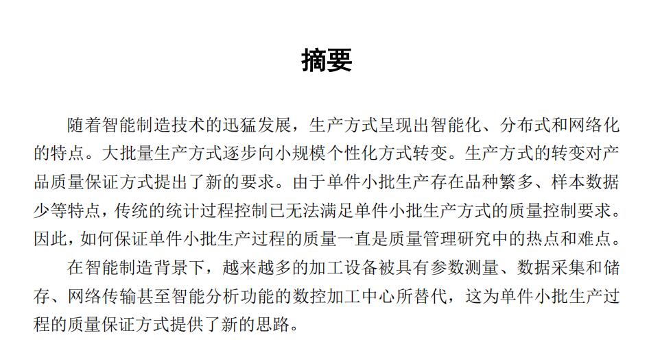 随着智能制造技术的迅猛发展,生产方式呈现出智能化、分布式和网络化的特点。大批量生产方式逐步向小规模个性化方式转变。生产方式的转变对产品质量保证方式提出了新的要求。由于单件小批生产存在品种繁多、样本数据少等特点,传统的统计过程控制已无法满足单件小批生产方式的质量控制要求。因此,如何保证单件小批生产过程的质量一直是质量管理研究中的热点和难点。