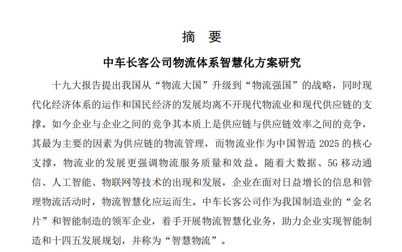 十九大报告提出我国从“物流大国”升级到“物流强国”的战略,同时现 代化经济体系的运作和国民经济的发展均离不开现代物流业和现代供应链的支 撑。如今企业与企业之间的竞争其本质上是供应链与供应链效率之间的竞争, 其最为主要的因素为供应链的物流管理,而物流业作为中国智造 2025 的核心 支撑,物流业的发展更强调物流服务质量和效益。随着大数据、5G 移动通 信、人工智能、物联网等技术的出现和发展,企业在面对日益增长的信息和管 理物流活动时,物流智慧化应运而生。中车长客公司作为我国制造业的“金名 片”和智能制造的领军企业,着手开展物流智慧化业务,助力企业实现智能制 造和十四五发展规划,并称为“智慧物流”。