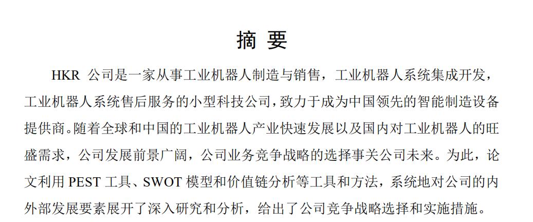 HKR 公司是一家从事工业机器人制造与销售,工业机器人系统集成开发,工业机器人系统售后服务的小型科技公司,致力于成为中国领先的智能制造设备提供商。随着全球和中国的工业机器人产业快速发展以及国内对工业机器人的旺盛需求,公司发展前景广阔,公司业务竞争战略的选择事关公司未来。为此,论文利用 PEST 工具、SWOT 模型和价值链分析等工具和方法,系统地对公司的内外部发展要素展开了深入研究和分析,给出了公司竞争战略选择和实施措施。