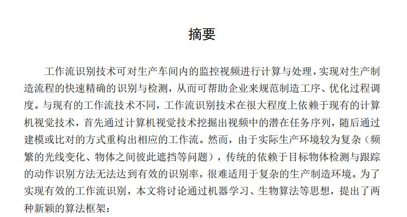工作流识别技术可对生产车间内的监控视频进行计算与处理,实现对生产制造流程的快速精确的识别与检测,从而可帮助企业来规范制造工序、优化过程调度。与现有的工作流技术不同,工作流识别技术在很大程度上依赖于现有的计算机视觉技术,首先通过计算机视觉技术挖掘出视频中的潜在任务序列,随后通过建模或比对的方式重构出相应的工作流。然而,由于实际生产环境较为复杂(频繁的光线变化、物体之间彼此遮挡等问题),传统的依赖于目标物体检测与跟踪的动作识别方法无法达到有效的识别率,很难适用于复杂的生产制造环境。为了实现有效的工作流识别,本文将讨论通过机器学习、生物算法等思想,提出了两种新颖的算法框架