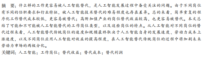 什么样的工作更容易被人工智能替代, 是人工智能发展过程中备受关注的问题。 由于不同岗位 有不同的任职要求和行业特征, 被人工智能技术替代的难易程度也存在差异。 总的来看, 简单重复的程 序化工作替代成本较低, 更容易被替代; 高附加值产业的岗位替代收益较高, 也更容易被替代。 本文总 结了可能和不可能被人工智能替代的工作岗位类型, 以及这些岗位的特点。 从人工智能对不同岗位的替 代过程来看, 人工智能替代传统岗位的速度和规模最终取决于人工智能自身的发展速度、 劳动力成本上 涨速度, 以及不同岗位应用人工智能对收益的提高程度, 在人工智能替代传统岗位的过程中将加剧未来 劳动力市场的两极分化。
