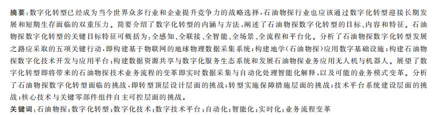 数字化转型已经成为当今世界众多行业和企业提升竞争力的战略选择,石油物探行业也应该通过数字化转型迎接长期发 展和短期生存面临的双重压力。简要介绍了数字化转型的内涵与方法,阐述了石油物探数字化转型的目标、内容和特征。石油 物探数字化转型的关键目标特征可概括为:全感知、全联接、全智能、全场景、全流程和平台化。分析了石油物探数字化转型发展 之路应采取的五项关键行动,即构建基于物联网的地球物理数据采集系统;构建地学(石油物探)应用数字基础设施;构建石油物 探数字化技术开发与应用平台;构建数据资源共享与数字化服务生态系统和发展石油物探业务应用无人机与机器人。展望了数 字化转型即将带来的石油物探技术业务流程的变革即实时数据采集与自动化处理智能化解释,以及可能的业务模式变革。分析 了石油物探数字化转型面临的挑战,即转型顶层设计层面的挑战;转型实施保障措施层面的挑战;技术平台系统建设层面的挑 战;核心技术与关键零部件组件自主可控层面的挑战。