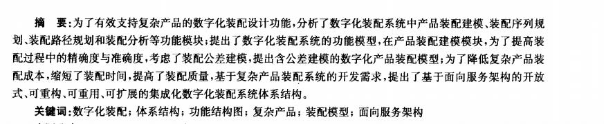 为了有效支持复杂产品的数字化装配设计功能,分析了数字化装配系统中产品装配建模、装配序列规 划、装配路径规划和装配分析等功能模块;提出了数字化装配系统的功能模型,在产品装配建模模块,为了提高装 配过程中的精确度与准确度,考虑了装配公差建模,提出含公差建模的数字化产品装配模型;为了降低复杂产品装 配成本,缩短了装配时间,提高了装配质量,基于复杂产品装配系统的开发需求,提出了基于面向服务架构的开放 式、可重构、可重用、可扩展的集成化数字化装配系统体系结构。