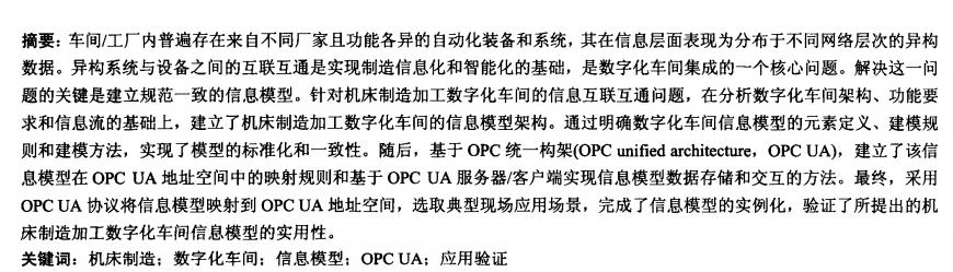 车间/-E厂内普遍存在来自不同厂家且功能各异的自动化装备和系统,其在信息层面表现为分布于不同网络层次的异构 数据。异构系统与设备之间的互联互通是实现制造信息化和智能化的基础,是数字化车间集成的一个核心问题。解决这一问 题的关键是建立规范一致的信息模型。针对机床制造加工数字化车间的信息互联互通问题,在分析数字化车间架构、功能要 求和信息流的基础上,建立了机床制造加工数字化车间的信息模型架构。通过明确数字化车间信息模型的元素定义、建模规 则和建模方法,实现了模型的标准化和一致性。随后,基于OPC统一构架(OPC unified architecture,OPC UA),建立了该信 息模型在OPC uA地址空间中的映射规则和基于OPC UA服务器/客户端实现信息模型数据存储和交互的方法。最终,采用 OPC UA协议将信息模型映射到OPC UA地址空间,选取典型现场应用场景,完成了信息模型的实例化,验证了所提出的机 床制造加工数字化车间信息模型的实用性。
