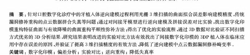 针对口腔数字化诊疗中的牙植入体逆向建模过程利用光栅3维扫描的曲面拟合误差影响建模精度,传统 漏洞修补重构的点云数据拼合失真等问题;通过对间接牙模型进行逆向建模及拼接误差对比实验,找出数字化印 模重构特征曲面与有效降噪的曲面重构平顺性弥补方法;得出了优化的实验流程,通过3D数据对比验证不同扫描 方式优劣的3D分析结果,研究结果表明改进的实验对比方法有效找出了间接数字化印模的3DP植人体在临床应 用中存在误差的原因,并验证了提高3维扫描精度的有效方法,降低了逆向建模中点云数据漏洞修补畸变率.