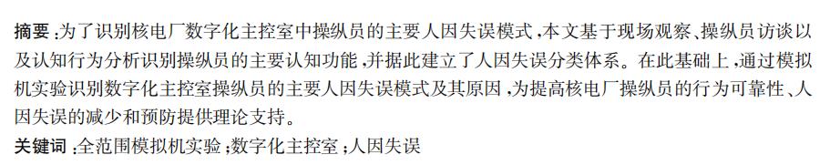 为了识别核电厂数字化主控室中操纵员的主要人因失误模式 ,本文基于现场观察 、操纵员访谈以 及认知行为分析识别操纵员的主要认知功能 ,并据此建立了人因失误分类体系 。 在此基础上 ,通过模拟 机实验识别数字化主控室操纵员的主要人因失误模式及其原因 ,为提高核电厂操纵员的行为可靠性 、人 因失误的减少和预防提供理论支持 。