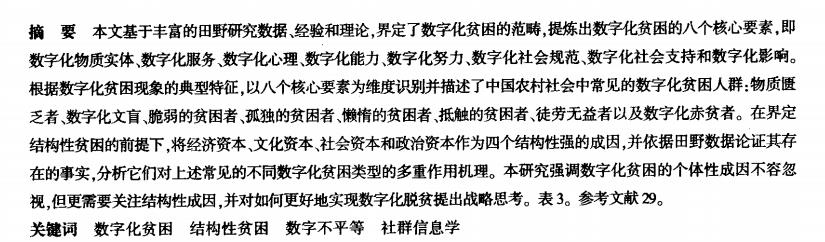基于丰富的田野研究数据、经验和理论,界定了数字化贫困的范畴,提炼出数字化贫困的八个核心要素,即 数字化物质实体、数字化服务、数字化D理、数字化能力、数字化努力、数字化社会规范、数字化社会支持和数字化影响。 根据数字化贫困现象的典型特征,以八个核心要素为维度识别并描述了中国农村社会中常见的数字化贫困人群:物质匮 乏者、数字化文盲、脆弱的贫困者、孤独的贫困者、懒惰的贫困者、抵触的贫困者、徒劳无益者以及数字化赤贫者。在界定 结构性贫困的前提下,将经济资本、文化资本、社会资本和政治资本作为四个结构性强的成因,并依据田野数据论证其存 在的事实.分析它们对上述常见的不同数字化贫困类型的多重作用机理。本研究强调数字化贫困的个体性成因不容忽 视,但更需要关注结构性成因,并对如何更好地实现数字化脱贫提出战略思考