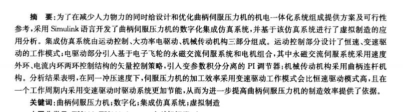 参考,采用Simulink语言开发了曲柄伺服压力机的数字化集成仿真系统,并基于该仿真系统进行了虚拟制造的应