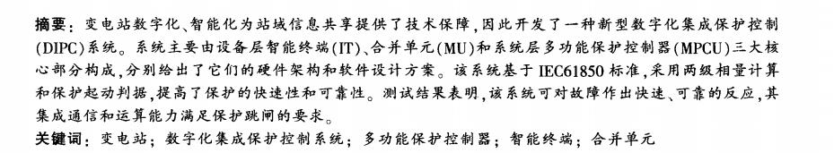变电站数字化、智能化为站域信息共享提供了技术保障,因此开发了一种新型数字化集成保护控制 (DIPC)系统。系统主要由设备层智能终端(IT)、合并单元(MU)和系统层多功能保护控制器(MPCU)三大核 心部分构成.分别给出了它们的硬件架构和软件设计方案。该系统基于IEC61850标准,采用两级相量计算 和保护起动判据.提高了保护的快速性和可靠性。测试结果表明,该系统可对故障作出快速、可靠的反应,其 集成通信和运算能力满足保护跳闸的要求。