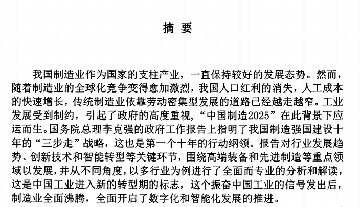 我国制造业作为国家的支柱产业,一直保持较好的发展态势。然而, 随着制造业的全球化竞争变得愈加激烈,我国人口红利的消失,人工成本 的快速增长,传统制造业依靠劳动密集型发展的道路已经越走越窄。工业 发展受到制约,引起了政府的高度重视,“中国制造2025”在此背景下应 运而生。国务院总理李克强的政府工作报告上指明了我国制造强国建设十 年的“三步走”战略,这也是第一个十年的行动纲领。报告对行业发展趋 势、创新技术和智能转型等关键环节,围绕高端装备和先进制造等重点领 域以发展,并从不同角度,以多行业为例进行了全面而专业的分析和解读, 这是中国工业进入新的转型期的标志,这个振奋中国工业的信号发出后, 制造业全面沸腾,全面开启了数字化和智能化发展的推进。