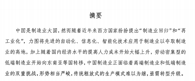 中国是制造业大国,然而随着近年来西方国家纷纷提出“制造业回归”和“再 工业化”,力图将先进的自动化、信息化、智能化技术应用于制造业以夺取制造 业的高地,加上随着国内经济水平的提高人力成本开始大幅上升,劳动密集型的 低端制造业开始向东南亚等国转移,中国制造业正面临着高端制造业和低端制造 业的双重挑战,形势相当严峻,传统粗放式的生产模式难以为继,亟需转型升级。