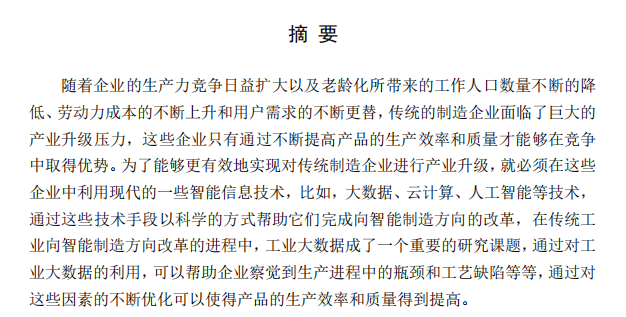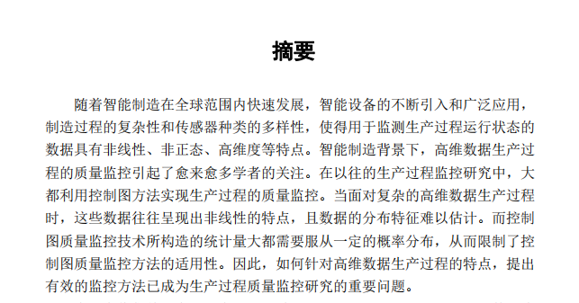 随着智能制造在全球范围内快速发展,智能设备的不断引入和广泛应用, 制造过程的复杂性和传感器种类的多样性,使得用于监测生产过程运行状态的 数据具有非线性、非正态、高维度等特点。智能制造背景下,高维数据生产过 程的质量监控引起了愈来愈多学者的关注。在以往的生产过程监控研究中,大 都利用控制图方法实现生产过程的质量监控。当面对复杂的高维数据生产过程 时,这些数据往往呈现出非线性的特点,且数据的分布特征难以估计。而控制 图质量监控技术所构造的统计量大都需要服从一定的概率分布,从而限制了控 制图质量监控方法的适用性。因此,如何针对高维数据生产过程的特点,提出 有效的监控方法已成为生产过程质量监控研究的重要问题。