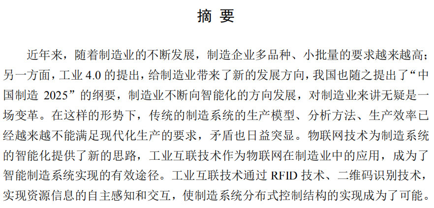 近年来,随着制造业的不断发展,制造企业多品种、小批量的要求越来越高; 另一方面,工业 4.0 的提出,给制造业带来了新的发展方向,我国也随之提出了“中 国制造 2025”的纲要,制造业不断向智能化的方向发展,对制造业来讲无疑是一 场变革。在这样的形势下,传统的制造系统的生产模型、分析方法、生产效率已 经越来越不能满足现代化生产的要求,矛盾也日益突显。物联网技术为制造系统 的智能化提供了新的思路,工业互联技术作为物联网在制造业中的应用,成为了 智能制造系统实现的有效途径。工业互联技术通过 RFID 技术、二维码识别技术, 实现资源信息的自主感知和交互,使制造系统分布式控制结构的实现成为了可能。