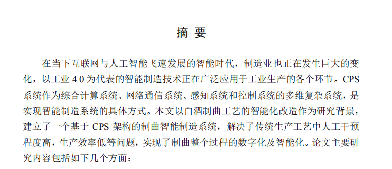 在当下互联网与人工智能飞速发展的智能时代,制造业也正在发生巨大的变 化,以工业 4.0 为代表的智能制造技术正在广泛应用于工业生产的各个环节。CPS 系统作为综合计算系统、网络通信系统、感知系统和控制系统的多维复杂系统,是 实现智能制造系统的具体方式。本文以白酒制曲工艺的智能化改造作为研究背景, 建立了一个基于 CPS 架构的制曲智能制造系统,解决了传统生产工艺中人工干预 程度高,生产效率低等问题,实现了制曲整个过程的数字化及智能化。