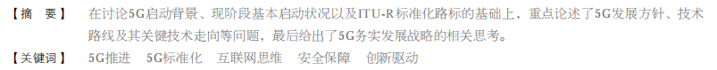 在讨论5G启动背景、现阶段基本启动状况以及ITU-R标准化路标的基础上,重点论述了5G发展方针、技术 路线及其关键技术走向等问题,最后给出了5G务实发展战略的相关思考。