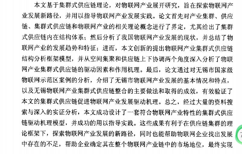 物联网作为一种战略性新兴产业,是国民经济的重要组成部分,也是支撑 和引导其他产业转变发展方式的重要基础。近年来,随着科学技术的不断进步, 全球物联网产业迅猛发展。据估计,2013年全球物联网产业规模将超过1700亿 美元。为抢占经济科技制高点,美、欧、日韩等发达国家纷纷将物联网产业提 升到国家发展的战略高度。在国内,物联网产业已经被提升到国家战略层面高 度,很多城市都出台了物联网产业发展规划或行动计划,加快了推进物联网发 展的步伐。然而,物联网产业的发展也面临着显著的供需矛盾和一些深层次的 问题。一方面,我国经济社会各领域蕴含巨大的物联网应用需求;另一方面, 我国物联网产业还处在零散应用的产业启动期,无法满足经济社会需求,距离 大规模产业化推广也还存在很大差距。如何从理论上分析物联网产业发展演进 的路径,从发展战略、发展模式等方面提出相应对策,指导物联网产业的发展 壮大和升级,是我国信息产业发展、技术转化创新、提升国家信息产业竞争力 的重要问题,本文针对这一问题进行了探索性的研究。 本文基于集群式供应链理论,对物联网产业展开研究,旨在探索物联网产 业发展新路径,并用以指导物联网产业发展实践。论文首先对产业集群、供应 链、集群式供应链和物联网产业的相关理论概念进行了界定,尤其给出了集群 式供应链内在结构体系;然后分析了我国物联网产业发展的现状,并总结了物 联网产业的发展趋势和特征:进而,本文创新的提出物联网产业集群式供应链 结构分析框架模型,并从空间集聚和供应链上下协调两个角度深入分析了物联 网产业集群式供应链的驱动因素和作用机理。最后,论文通过对无锡市国家级 物联网示范区案例的分析,介绍了无锡市物联网产业发展的基本情况和特点, 以及无锡物联网产业集群式供应链整合的主要做法和取得的成效,有效验证了 本文的集群式供应链促进物联网产业发展驱动机理。总之,经过大量的资料搜 索与深入的实证分析,本文成功设计了一套符合物联网产业特性的集群式供应 链驱动机理模型,并成功的用以指导实践。这些成果有利于在供应链集群的理 论框架下,探索物联网产业发展的新路径,同时也能帮助物联网企业找出发展 中存在的不足,帮助企业确定其在整个物联网产业链中的市场地位,最终实现 摘要 物联网供应链集群式发展。