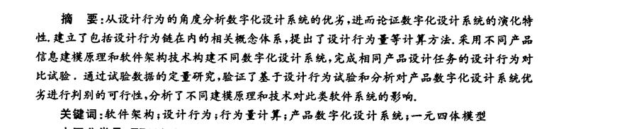 从设计行为的角度分析数字化设计系统的优劣,进而论证数字化设计系统的演化特 性.建立了包括设计行为链在内的相关概念体系,提出了设计行为量等计算方法.采用不同产品 信息建模原理和软件架构技术构建不同数字化设计系统,完成相同产品设计任务的设计行为对 比试验.通过试验数据的定量研究,验证了基于设计行为试验和分析对产品数字化设计系统优 劣进行判别的可行性,分析了不同建模原理和技术对此类软件系统的影响.