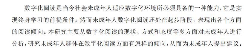 数字化阅读是当今社会未成年人适应数字化环境所必须具备的一种能力,它是实 现终身学习的前提条件。然而未成年人数字化阅读还处在起步阶段,表现出各个方面 的阅读倾向。本研究主要从数字化阅读的现状、方式和态度等多方面对未成年人进行 分析,研究未成年人群体在数字化阅读方面有怎样的倾向,从而为未成年人提出建议。