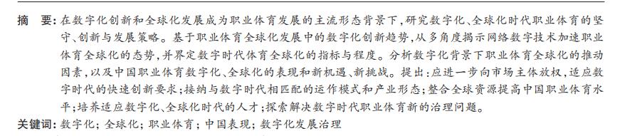 在数字化创新和全球化发展成为职业体育发展的主流形态背景下,研究数字化、全球化时代职业体育的坚 守、创新与发展策略。基于职业体育全球化发展中的数字化创新趋势,从多角度揭示网络数字技术加速职业 体育全球化的态势,并界定数字时代体育全球化的指标与程度。分析数字化背景下职业体育全球化的推动 因素,以及中国职业体育数字化、全球化的表现和新机遇、新挑战。提出:应进一步向市场主体放权,适应数 字时代的快速创新要求;接纳与数字时代相匹配的运作模式和产业形态;整合全球资源提高中国职业体育水 平;培养适应数字化、全球化时代的人才;探索解决数字时代职业体育新的治理问题。