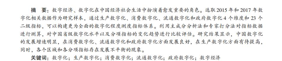 数字经济、 数字化在中国经济社会生活中扮演着愈发重要的角色。 选取 2015 年和 2017 年数 字化相关数据作为研究样本, 通过生产数字化、 消费数字化、 流通数字化和政府数字化 4 个维度和 23 个 二级指标, 可以构建更为全面的数字化程度测度指标体系。 利用主成分分析法和专家打分法对指标数据 进行测算, 对中国省级数字化水平以及分项指标的变化趋势进行比较评估。 研究结果显示, 中国数字化 的发展增速明显, 在消费数字化、 流通数字化和政府数字化方面发展良好, 在生产数字化方面有待提高, 同时, 各个区域和各分项指标存在发展不平衡的现象。