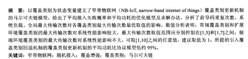 以覆盖类别为状态变量建立了窄带物联网(NB.IoT,narrow-band intemet ofthings)覆盖类别更新机制 的马尔可夫链模型,给出了平均接入失败概率和平均功耗的优化模型及求解办法,分析了前导码重复次数、系 统负载、全局最大传输次数对各覆盖类别最大传输次数最优取值的影响。数值分析表明:常规覆盖类别和扩展 环境覆盖类别的最大传输次数对系统性能影响较大,最大传输次数取值范围应分别控制在[1,5]和[1,7]之间;极 端环境覆盖类别的最大传输次数对系统性能影响不大,可取[1,10】之间的任意值,建议取值为1;所提的引入覆 盖类别回退机制的覆盖类别更新机制的平均功耗比协议模型低约95%。