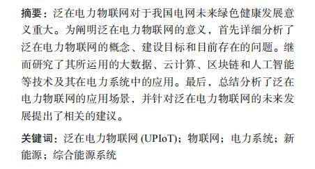 泛在电力物联网对于我国电网未来绿色健康发展意 义重大。为阐明泛在电力物联网的意义,首先详细分析了 泛在电力物联网的概念、建设目标和目前存在的问题。继 而研究了其所运用的大数据、云计算、区块链和人工智能 等技术及其在电力系统中的应用。最后,总结分析了泛在 电力物联网的应用场景,并针对泛在电力物联网的未来发 展提出了相关的建议。